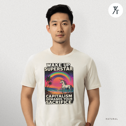 Capitalist Dreamscape: Retro Unicorn Beach, Satirical 80s Graphic Design- Graphic T-shirt