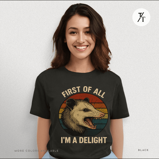 Snarky Funny "First of All I'm a Delight" Opossum Tee 🦝 - Hilarious Graphic T-shirt