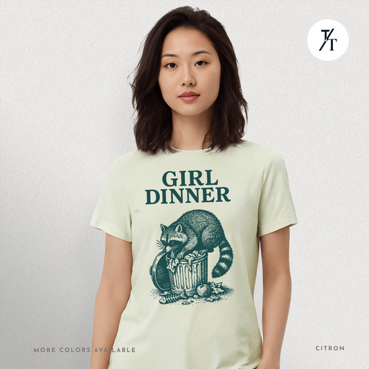 Girl Dinner: Raccoon Scavenging Trash, Vintage Woodcut Style Illustration, Teal and Black Contrast Artwork- Graphic T-shirt