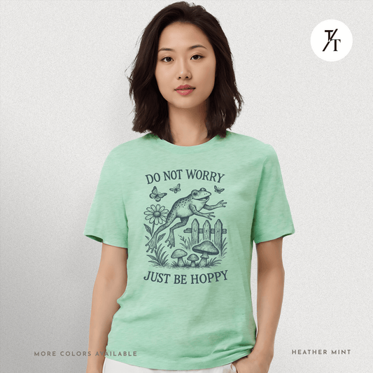'Don't worry, just be hoppy' - inspirational frog Cottagecore t-shirt