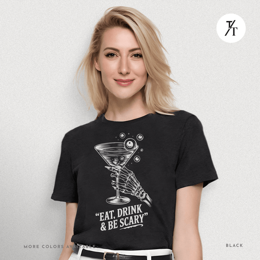 Eat, Drink & Be Scary Tee – Funny Skeleton Halloween Cocktail Shirt