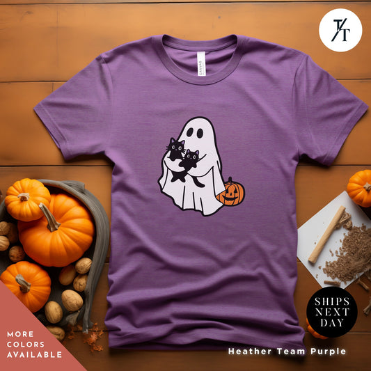 Ghost Holding Black Cat Shirt for Halloween Gift and Fun