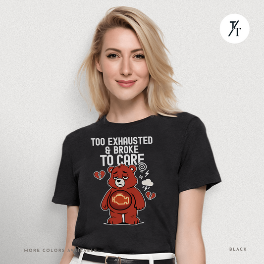 T-Shirt with Carebear 'Too Exhausted and Broke to Care'